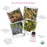 Royal Green Multi Woman dostarcza niezbędne dla kobiet witaminy i minerały, które czerpiemy z pożywienia. Jest to naturalny suplement zawierający co najmniej 97% specjalnie wyselekcjonowanych wartościowych składników roślinnych uprawianych bez użycia pestycydów! Pozostałe 3% to witamina D3 i kilka minerałów komplementujących skład multi.