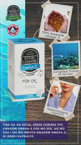 Dodane przeciwutleniacze przeciwdziałają utlenianiu się ryby, a pomarańczowy aromat zapobiega ewentualnemu posmakowi rybnemu. Wysoka koncentracja bo aż 79% omega 3 (530 mg EPA, 160 mg DHA & 100 mg pozostałych omega-3) oznacza, że wystarczy 1 kapsułka Royal Green Fish Oil, żeby pokryć Twoje dzienne zapotrzebowanie.